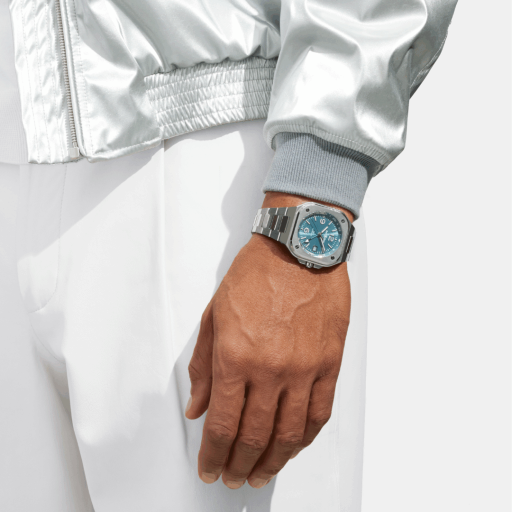 El BR 05 GMT Sky Blue es la pieza ideal para quienes viven entre husos horarios. Con su esfera azul cielo y su función GMT, ofrece una legibilidad impecable y un diseño fresco que evoca cielos despejados y horizontes abiertos. La caja de acero de 41 mm y el brazalete integrado garantizan comodidad y resistencia, mientras que el calibre automático BR-CAL.325 ofrece fiabilidad en cada viaje.