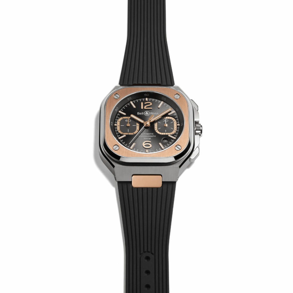 BR 05 Chrono Grey Steel & Gold: El lujo del contrasteInspirado en el estilo sport-chic de los años 70, el BR 05 Chrono Grey Steel & Gold combina acero satinado y pulido con oro rosa de 18 quilates, logrando una estética refinada y poderosa. Su esfera de rutenio gris con contadores de cronógrafo y detalles en oro ofrece un juego de contrastes único. Equipado con el calibre automático BR-CAL.326, este cronógrafo urbano es tan preciso como sofisticado.