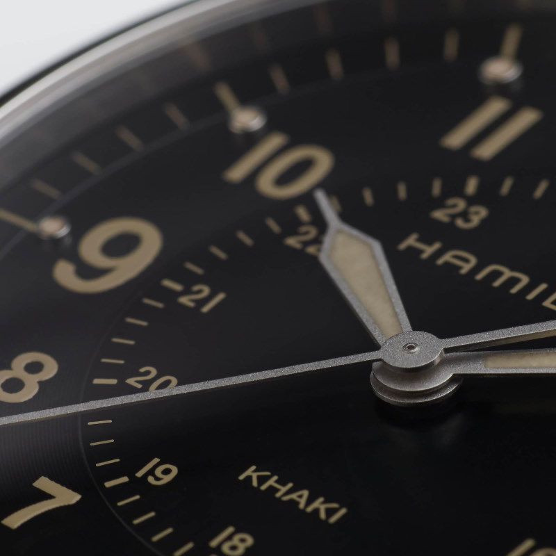 Reloj Hamilton Khaki Field de movimiento de cuarzo. Caja de acero inoxidable de 40 mm. Esfera negra realzada con índices con Super-LumiNova®  hermética hasta 50 m con cristal de zafiro y correa de piel color marrón.