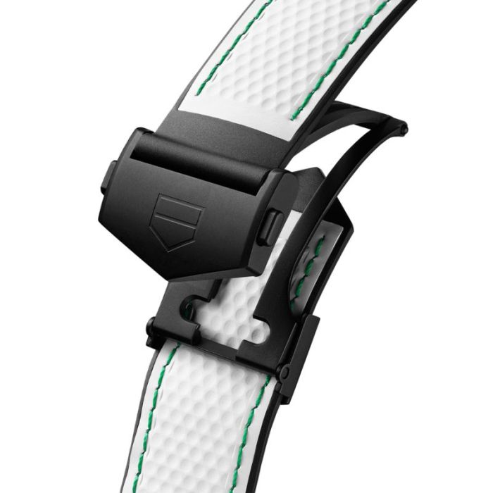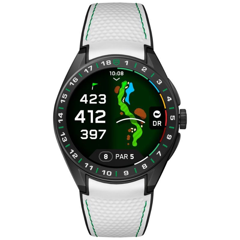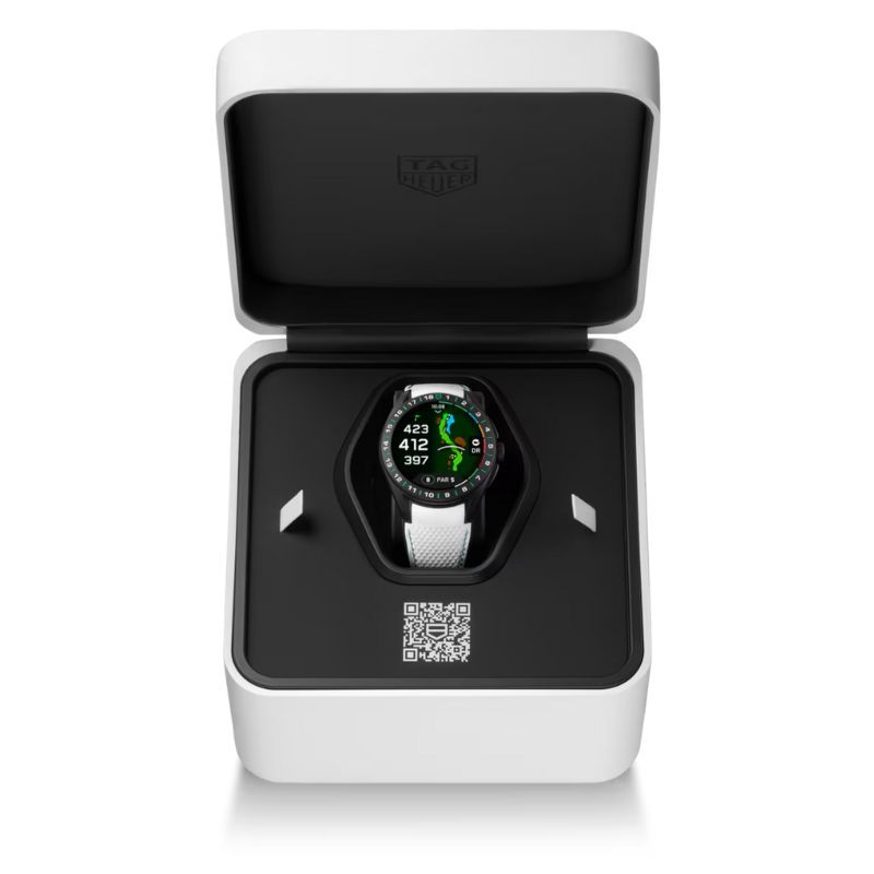 Reloj de TAG Heuer Connected Calibre E5 Golf Edition con caja de 45 mm en titanio grado 2 con revestimiento de DLC negro arenado con bisel con 18 hoyos grabados. Su aplicación específica para golf lo convierten en un compañero sofisticado para cualquier partida. Este modelo optimiza la experiencia de juego con un seguimiento detallado y funciones TAG Heuer personalizadas. Correa con diseño de pelota de golf en blanco con doble cierre de seguridad desplegable – Acero DLC en negro. Incluye segunda correa en color negro. Estanqueidad hasta 50 metros.